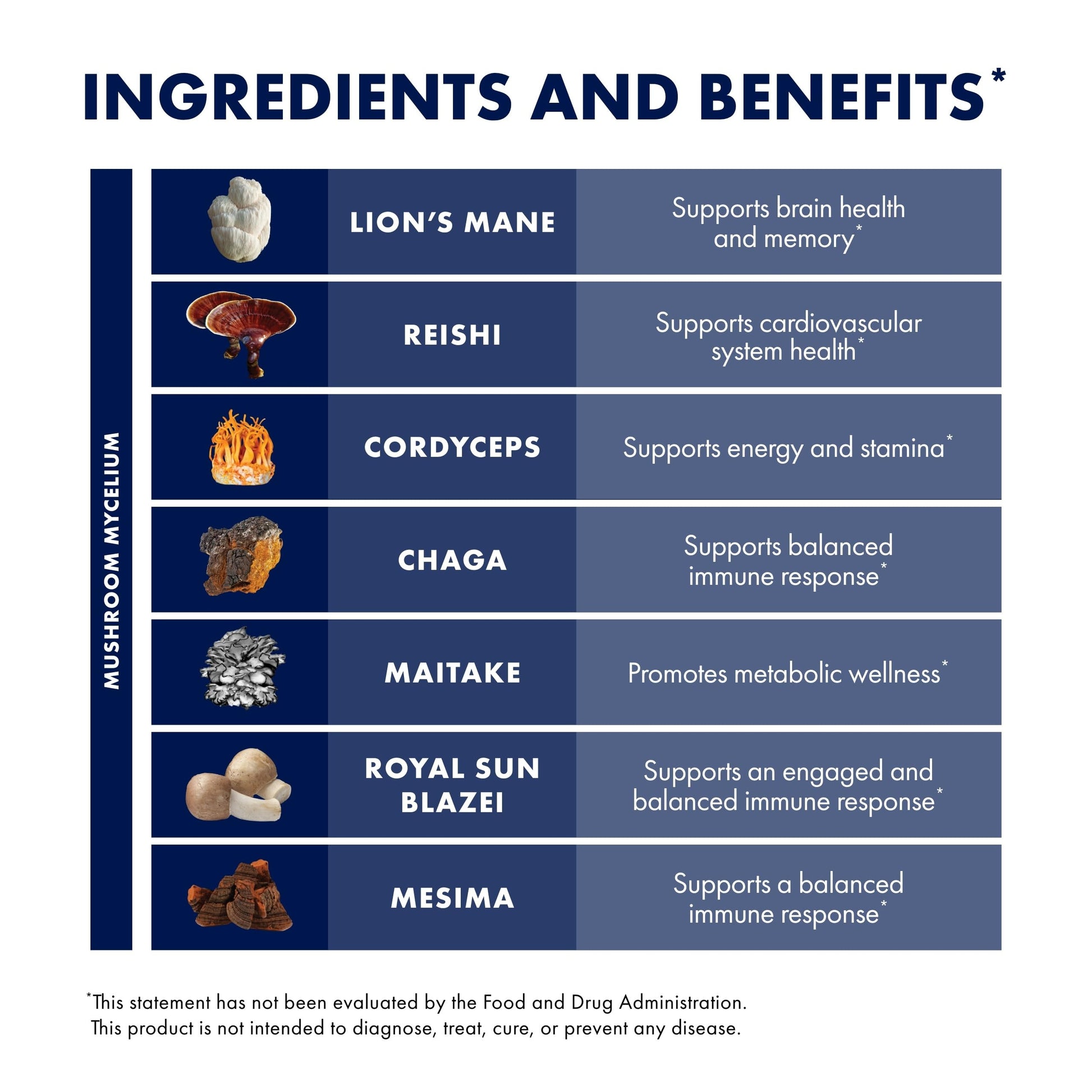- Key Ingredients: 7-species mushroom powder blend, including Lion’s Mane, Reishi, Chaga, Cordyceps, and Maitake